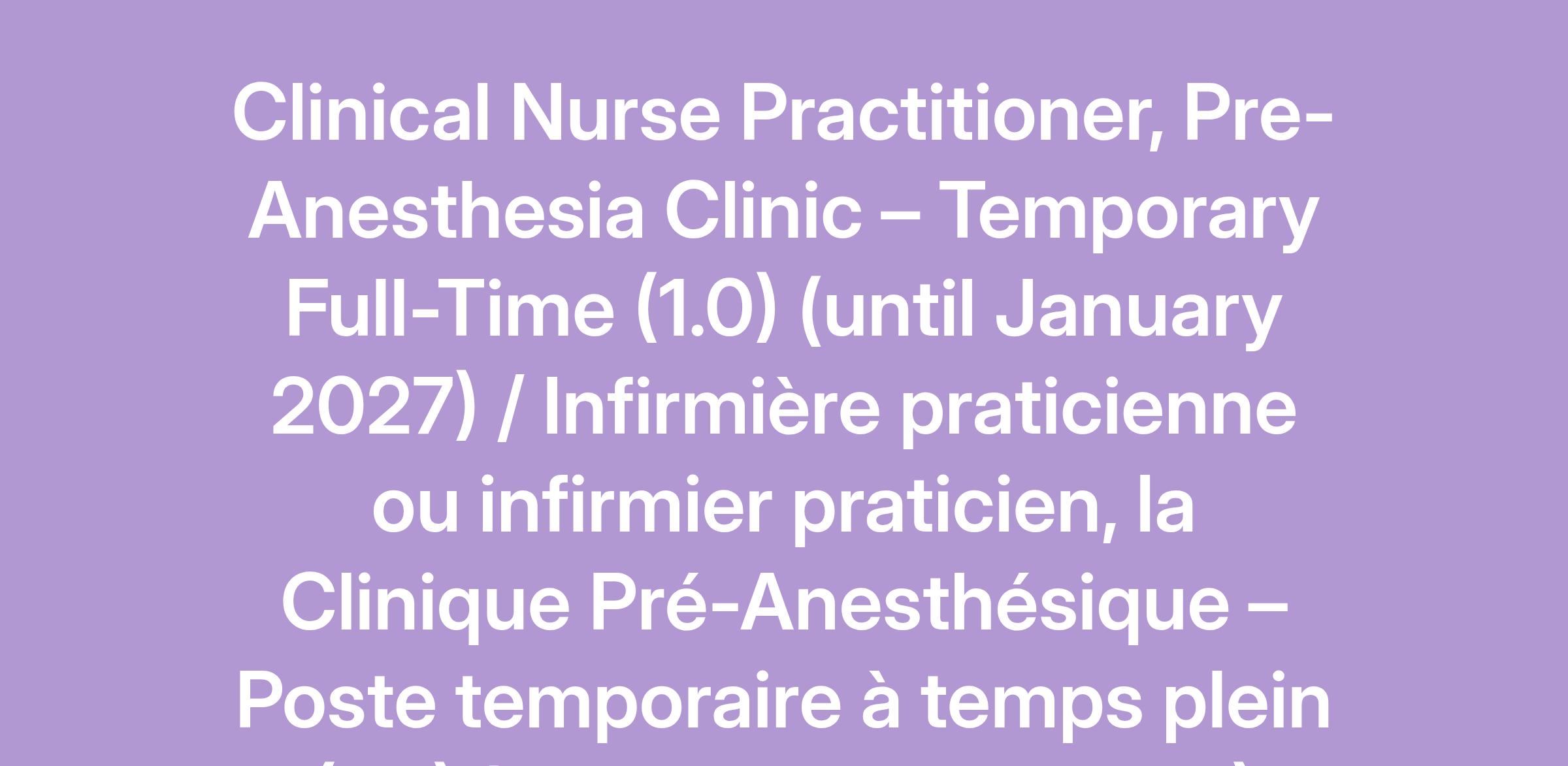The Clinical Nurse Practitioner (NP) at CHEO is a nurse in an advanced nursing practice position with additional educational preparation from an accredited NP program and who has clinical expertise in a pediatric nursing subspecialty. The NP integrates the skills and knowledge from nursing and medicine within a broad framework of advanced nursing practice. The NP functions both autonomously and in collaboration with physicians and other health care providers to manage, in a comprehensive manner, the health care needs of an assigned number of perioperative patients. In this NP role, the individual will be working within the acute pain service providing clinical care to patients and families receiving pain modalities such as NCA, PCA, epidural analgesia, nerve blocks and infusions that may be opioid sparing such as Ketamine and Lidocaine. The NP will function both autonomously and in collaboration with Physicians, Nurse Practitioners, Nurses, Allied Health and other health care providers to to manage pain and symptoms both as an in and outpatient.