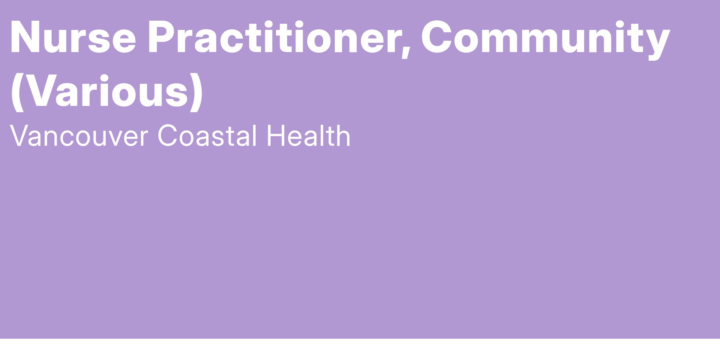 We have community, primary care and acute roles in Richmond, Vancouver, North Vancouver, Sea to Sky, Sunshine Coast, qathet, Bella Bella and Bella Coola.