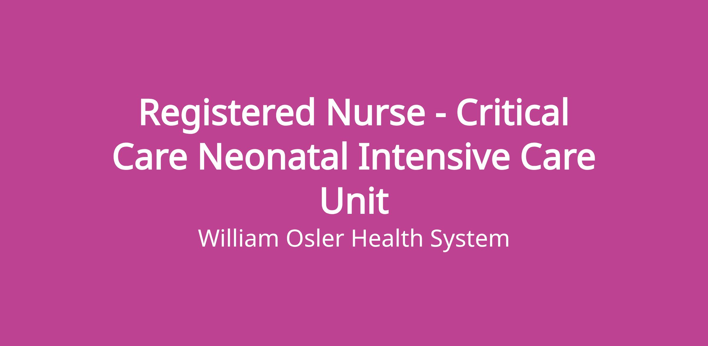 The Registered Nurse (RN) is a regulated health care professional who is accountable and responsible for providing quality patient focused nursing care to patients in the critical care Neonatal Intensive Care Unit (NICU). As part of the inter-professional health care team, the RN will practice according to the nursing practice expectations set by Osler, the regulatory practice standards of the College of Nurses and the legislative requirements set by the Regulated Health Professions Act.