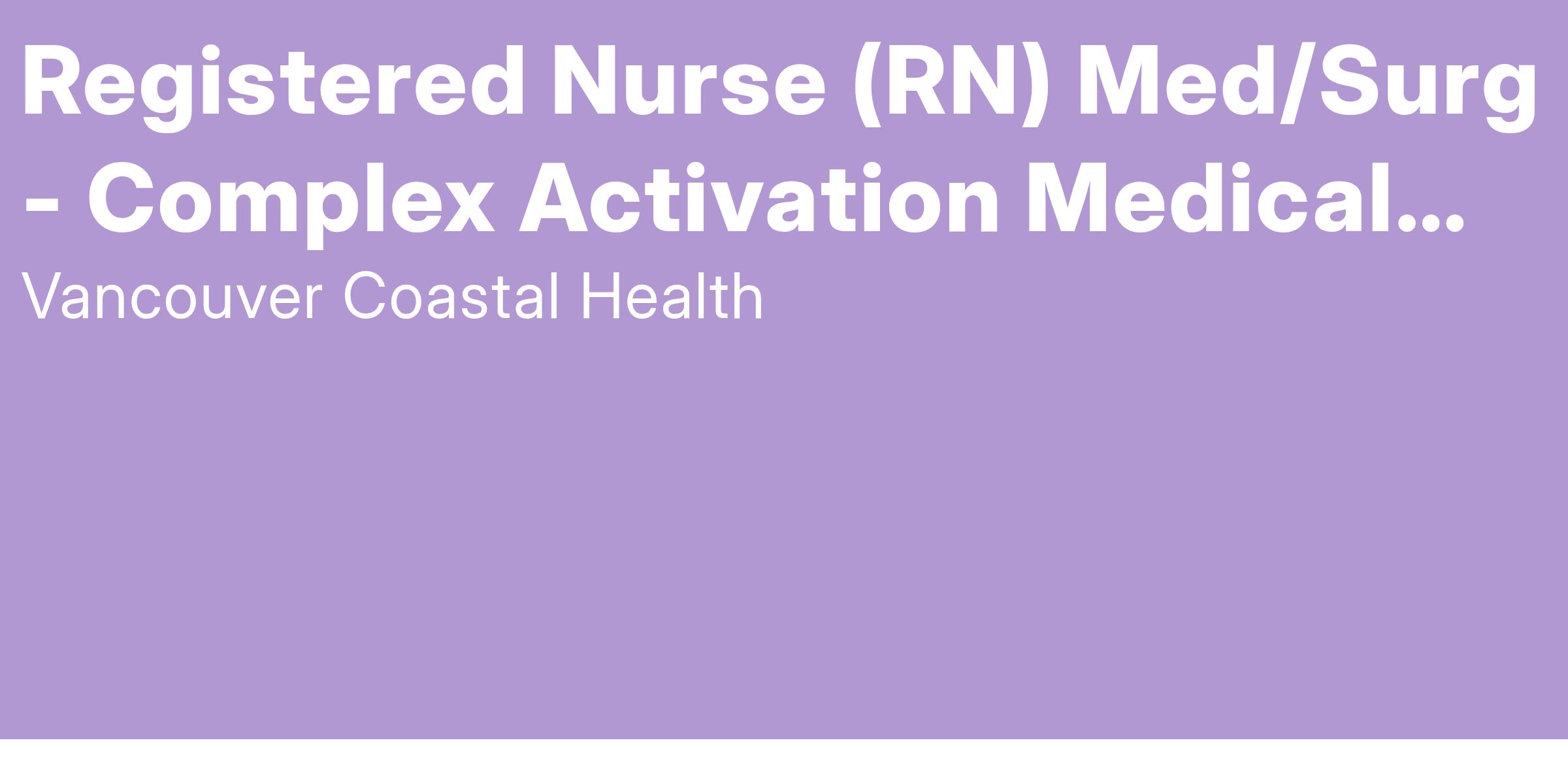 Vancouver Coastal Health is looking for a Registered Nurse to join the team in the Complex Activation Medical Unit at UBC Hospital. Apply today to join our team!